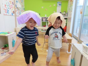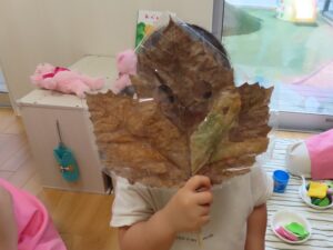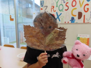 大きな葉っぱのお面で見せ合いっこしたり、お人形さんのお世話をしたり