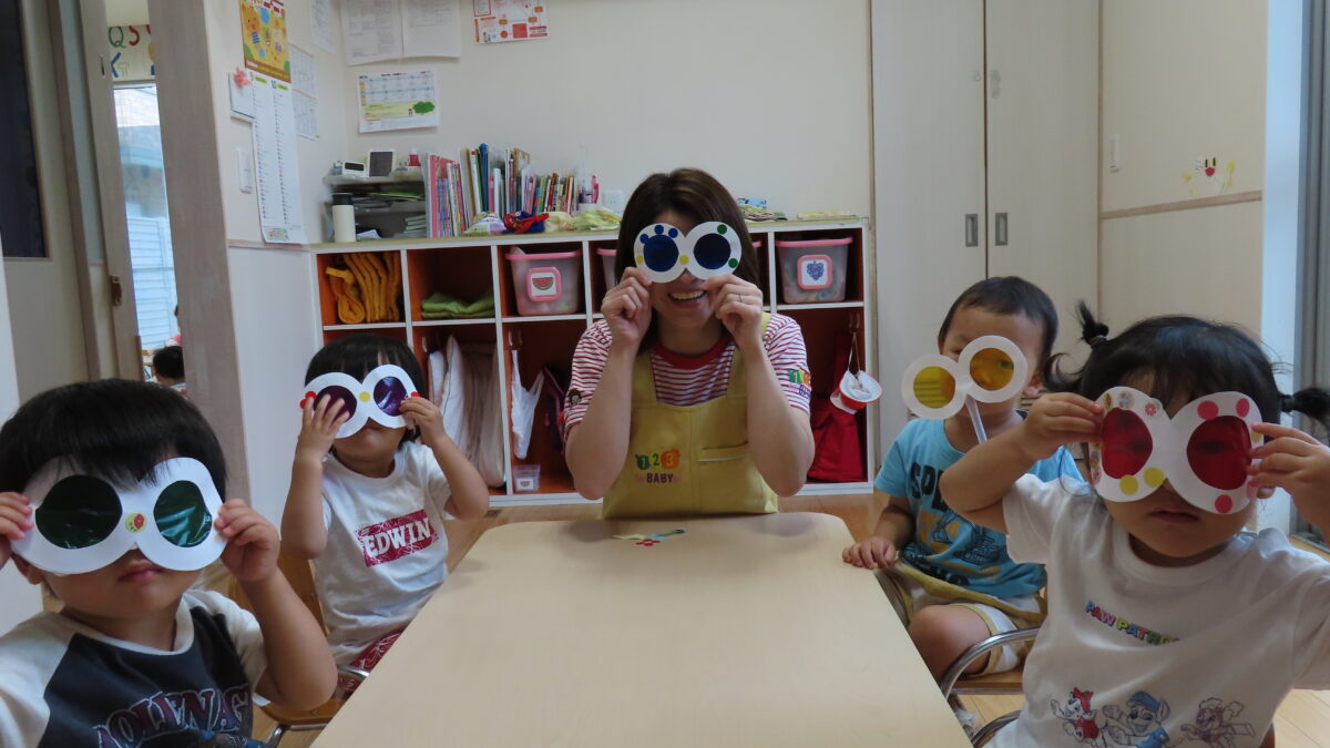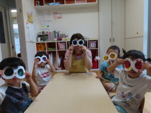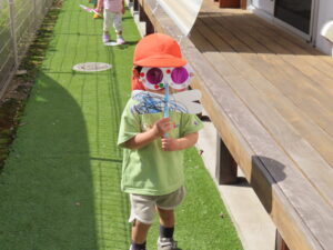 つばさ組さんは自分たちで作ったトンボのめがねをもって園庭にレッツゴー!(^^)!