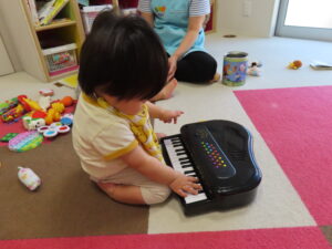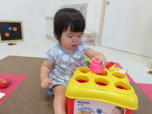うみ組さんはお部屋で型はめパズルや音のなる玩具で遊んだよ🎵