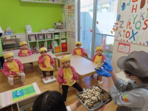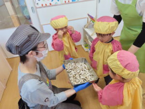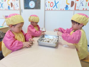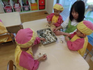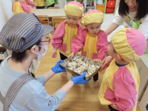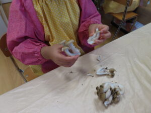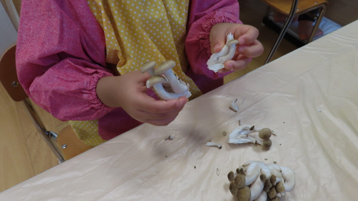たいよう組さんは食育の日。しめじ割りに挑戦!(^^)!