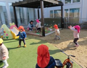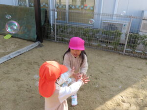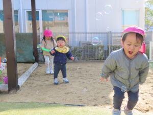 しゃぼん玉をつかまえようと追いかけたり、小さな手をのばしてパチン!