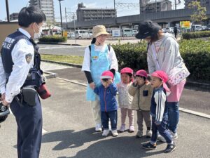 警察署の前ではパトカーを見せてもらい、お巡りさんにもごあいさつしたよ