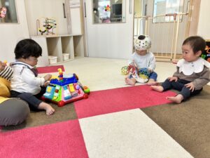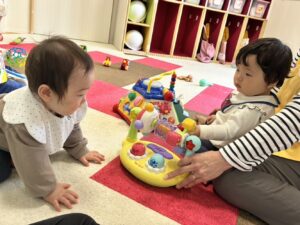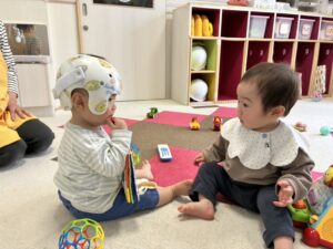うみ組さんは、はじめての保育園生活にちょっぴりドキドキ。先生に見守られながら、興味のあるおもちゃに触れたり、お友だちの存在を感じたりと、少しずつ笑顔も見られてきたよ。